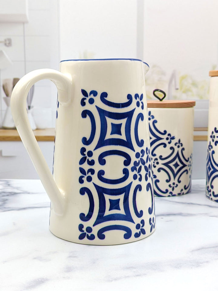 Elevate your dining experience with our Tradition Portuguese Pottery Ceramic Pitcher, a perfect blend of tradition and modern design crafted in the renowned city of Caldas da Rainha. This pitcher features a vibrant blue and white design inspired by the iconic Traditional Portuguese Tiles, reflecting the nation's rich cultural heritage. Combining traditional craftsmanship with contemporary style, it adds an exciting touch to your table, bringing authentic Portuguese décor to your kitchen.